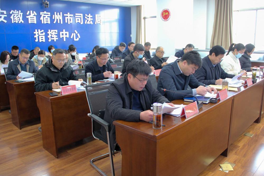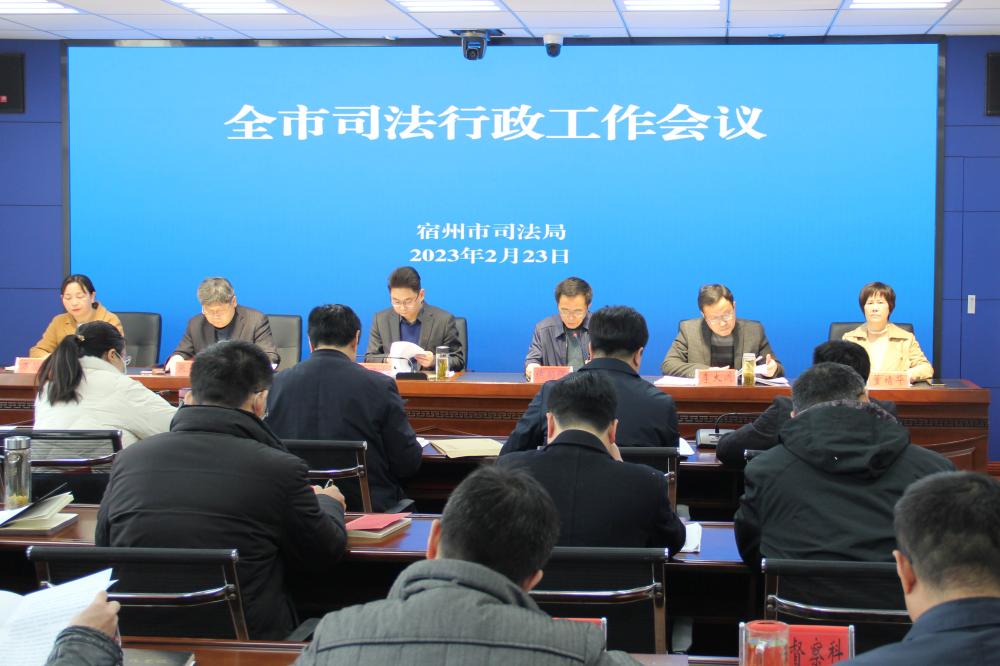 张晓光强调,今年是全面贯彻落实党的二十大精神的开局之年,全系统要以习近平新时代中国特色社会主义思想为指导,全面贯彻党的二十大精神,将“一以贯之五做到,踔厉奋发五提升”要求落到实处,以“各项工作全面提升”为目标,以“六聚焦、六提升”为抓手,下更大力气推动全面依法治市和司法行政工作实现更高质量发展。一要聚焦政治引领、提升履职担当能力,坚定不移加强党的全面领导。要以理论武装筑牢理想信念,让“四个意识”更加牢固、“四个自信”更加坚定、“两个维护”更加坚决。要以党建引领汇聚内生动力,塑造“法润宿城”党建特色品牌,推动党建和业务深度融合发展。要进一步涵养斗争精神、斗争本领,强化交账意识、答卷意识,以鲜明导向激发干事活力。二要聚焦依法治市、提升统筹协调能力,全力以赴深化法治宿州建设。要牢固树立习近平法治思想在全面依法治市和司法行政工作中的指导地位,推动习近平法治思想深入人心。要全力申报法治政府建设示范创建活动,争创有影响力、可复制推广的先进标杆。要探索建立健全领导干部述法考核评价具体标准和结果运用工作程序,创新法治督察督办机制,压实法治建设主体责任。三要聚焦良法善治、提升依法行政能力,凝心聚力推进法治政府建设。要推动重大行政决策规范运行,加大行政决策合法性审查力度,全面推进严格规范公正文明执法,加强关系群众切身利益的重点领域执法监督。要发挥复议应诉化解争议作用,巩固行政机关负责人出庭应诉工作成果,将出庭应诉率稳定在100%,推动市、县两级行政复议体制改革任务全面完成。四要聚焦一改两为、提升服务保障能力,千方百计助力优化营商环境。要以履约践诺助企纾困解难,巩固拓展公共政策兑现、违法行政行为整治、行政机关履行给付义务清查等工作成效。要以法治手段维护企业权益,着力解决民营企业在市场准入、产权保护、公平竞争等方面遇到的困难问题,发挥律师、仲裁、普法宣传等专业作用,指导企业依法诚信经营、帮助企业依法解决纠纷。五要聚焦法治为民、提升依法治理能力,毫不动摇推动法治利民惠民。要用高质量行政立法回应群众所盼,把解决群众“急难愁盼”的举措办法用法规制度的形式固化下来。要用高水平法治宣传提升群众所感,推动群众法治素养和社会治理法治化水平持续提升。要用高标准法律服务满足群众所需,提高律师、公证、司法鉴定、仲裁等法律服务的供给总量、质量和效率。六要聚焦维稳促安、提升执法监管能力,脚踏实地扛起安保维稳责任。要守好社区矫正安全基线,把防范脱管漏管、预防重新违法犯罪摆在监管工作重要位置。要把矛盾纠纷化解在一线,持续打造“宿纷速调”特色解纷品牌,筑牢重点人群管控防线,加强刑满释放人员衔接、服务、管理,让安保维稳的关口进一步前移。